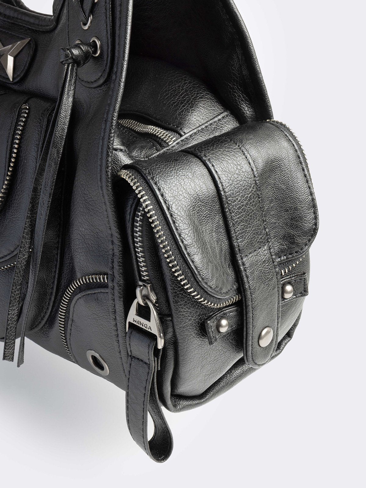 Black faux leather shoulder bag with lace-up, zip and hardware details and multiple pockets