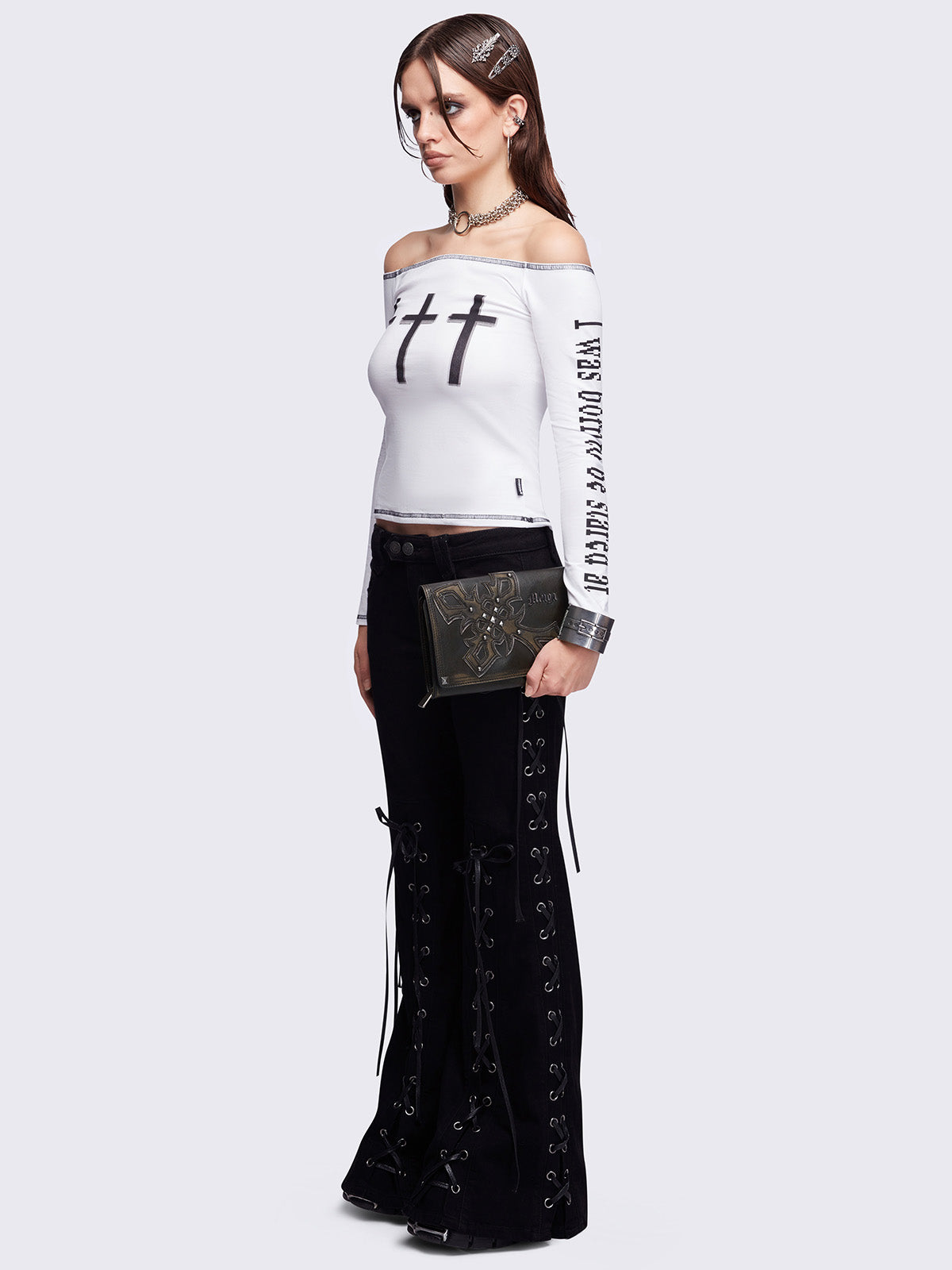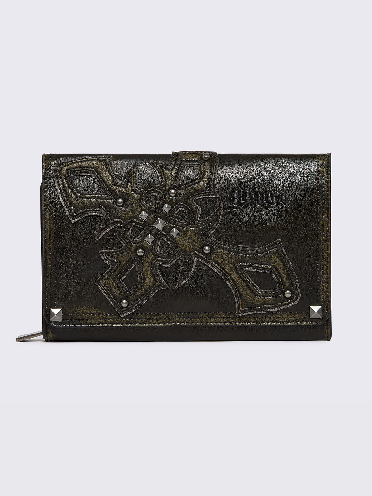 Black washed faux leather wallet featuring a cross patch and stud details.