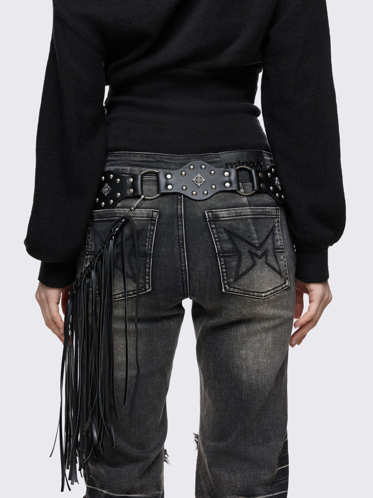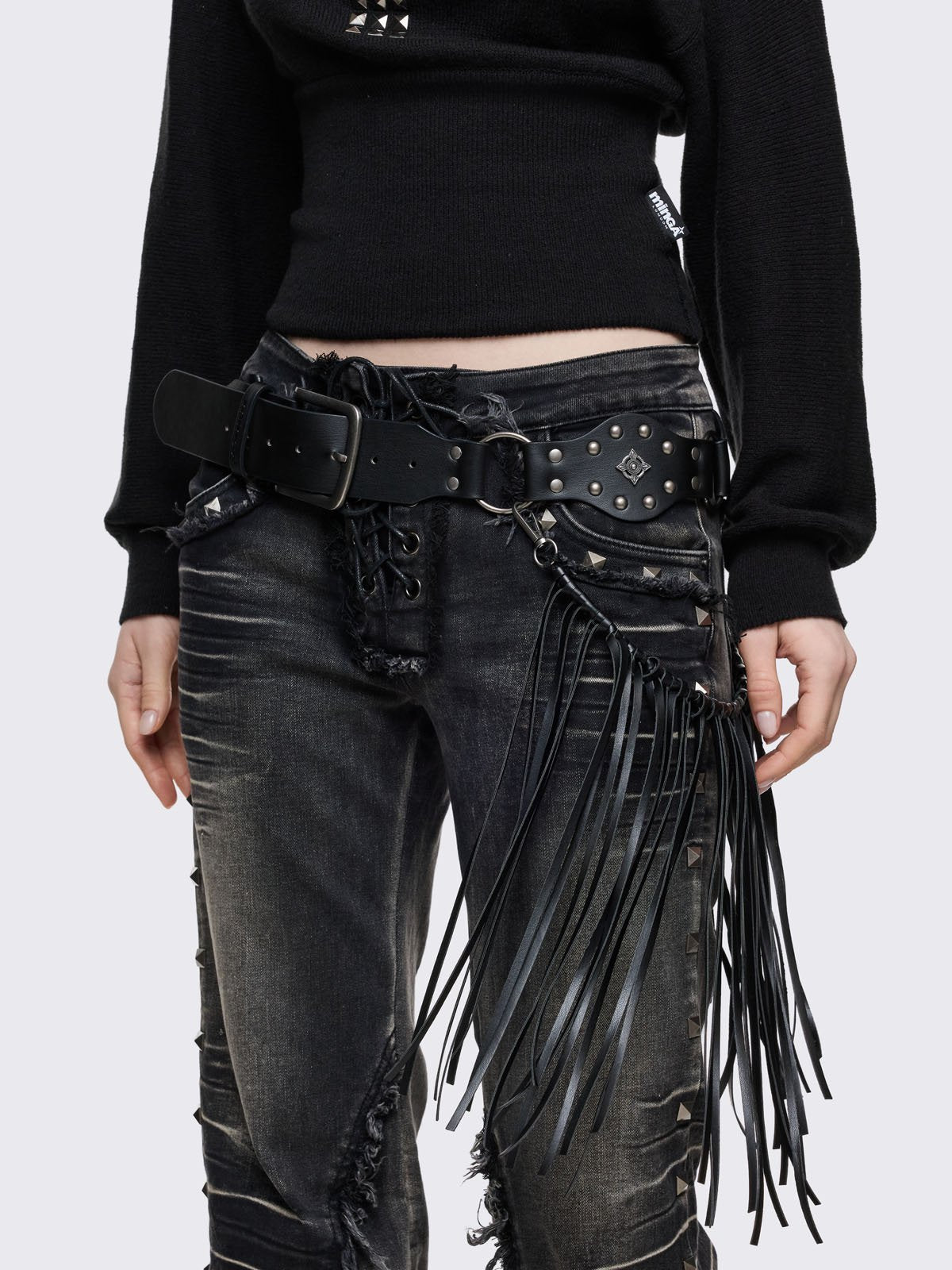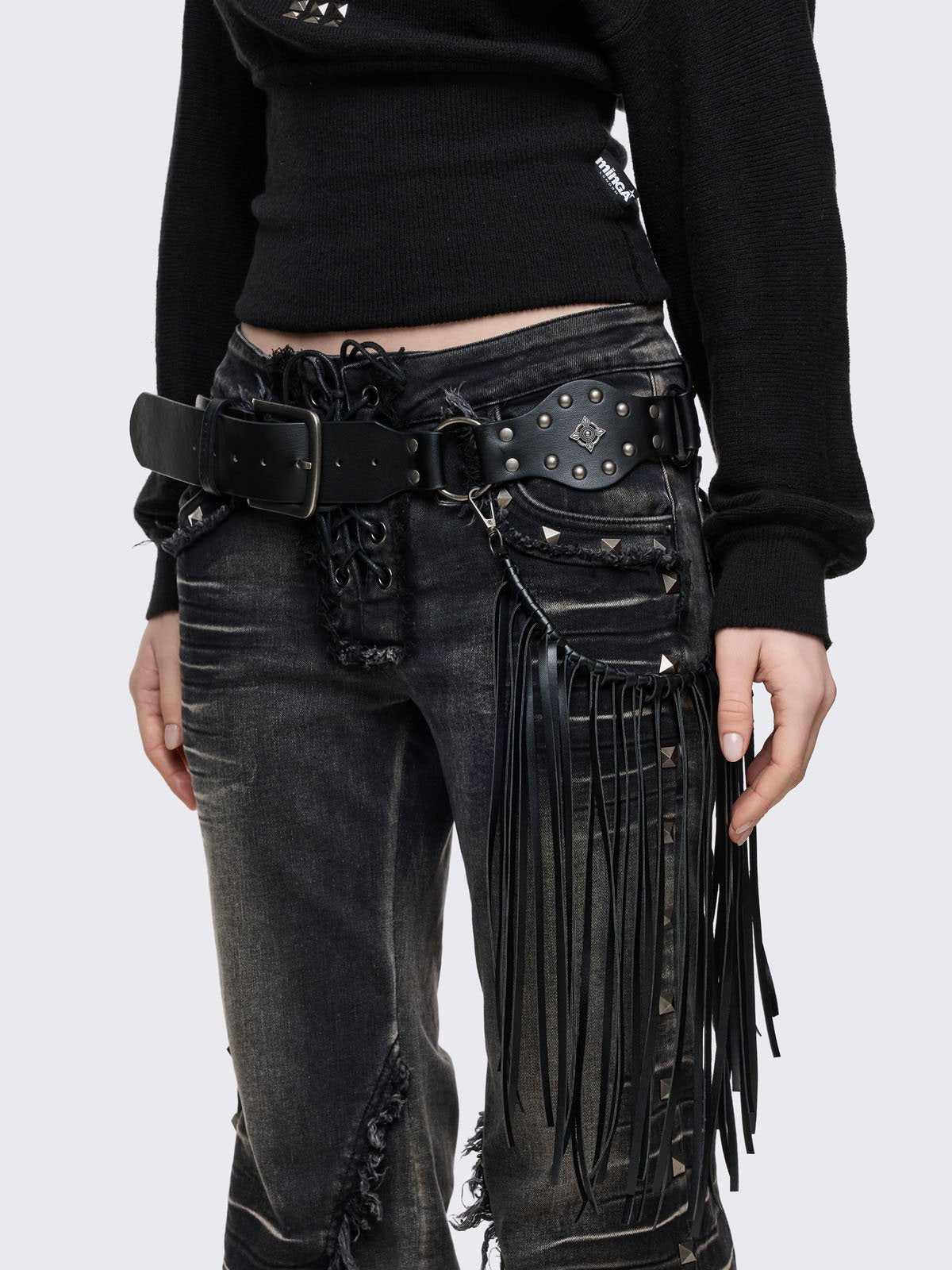 Black vegan leather concho belt with silver stud details