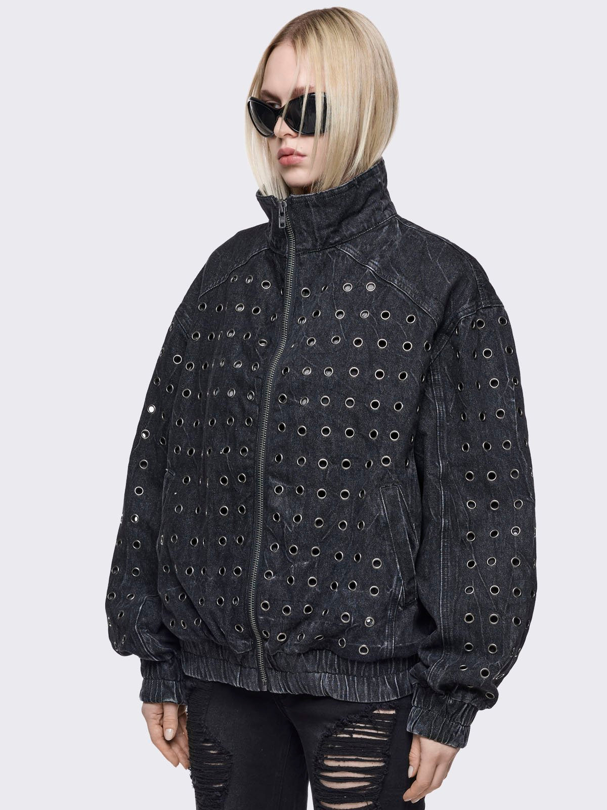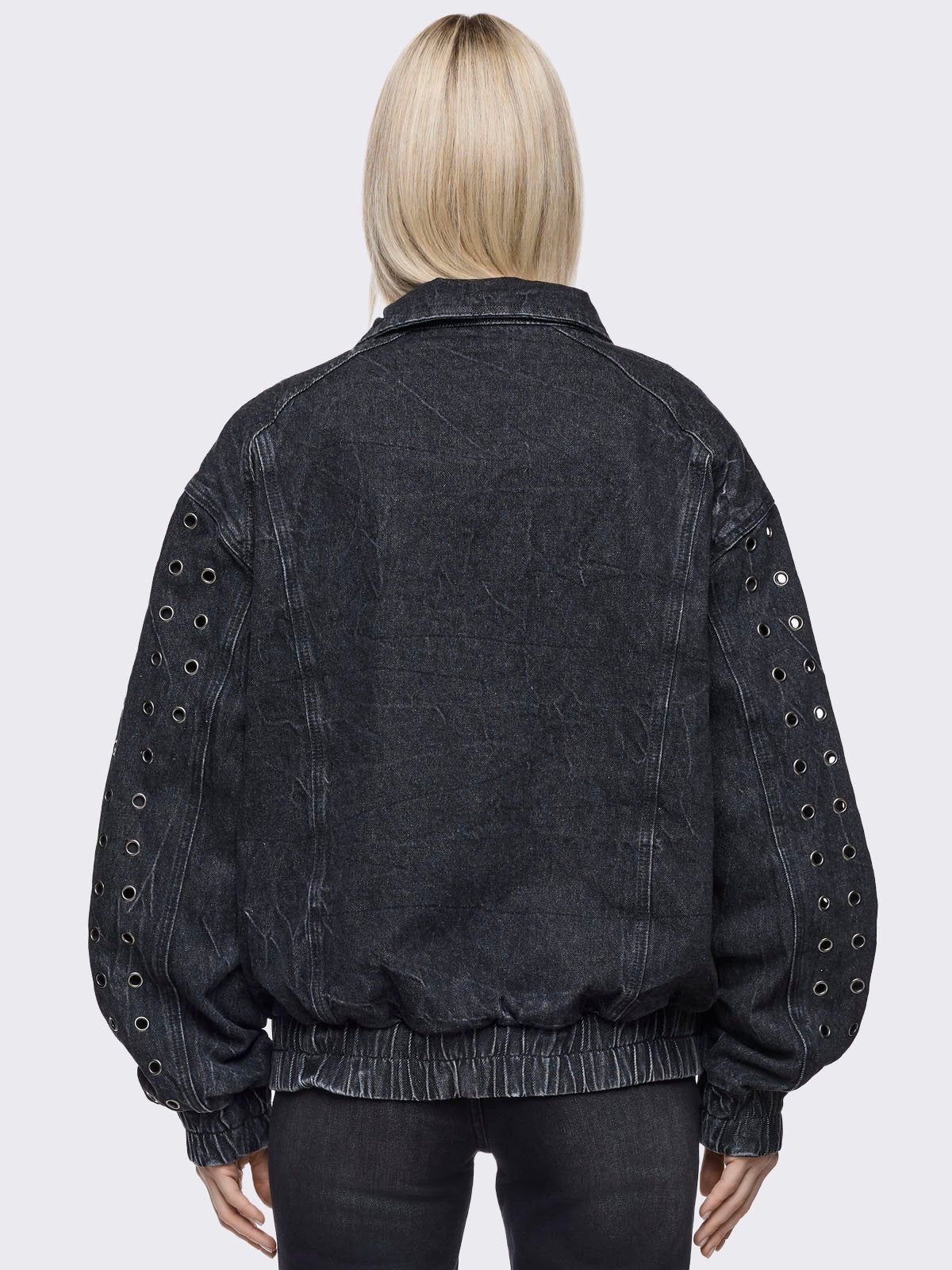 Black washed denim oversize bomber jacket with silver eyelets and seam details.