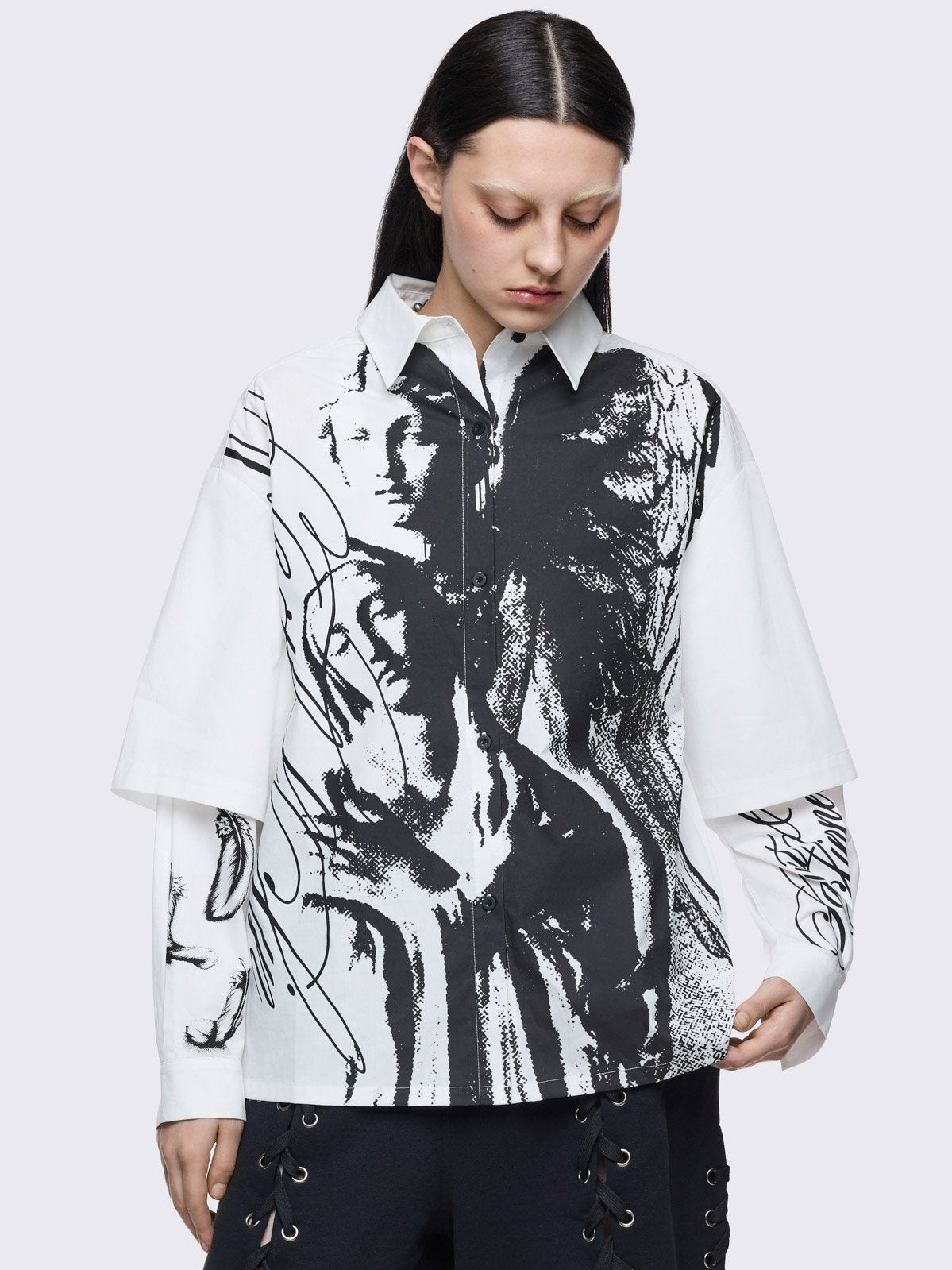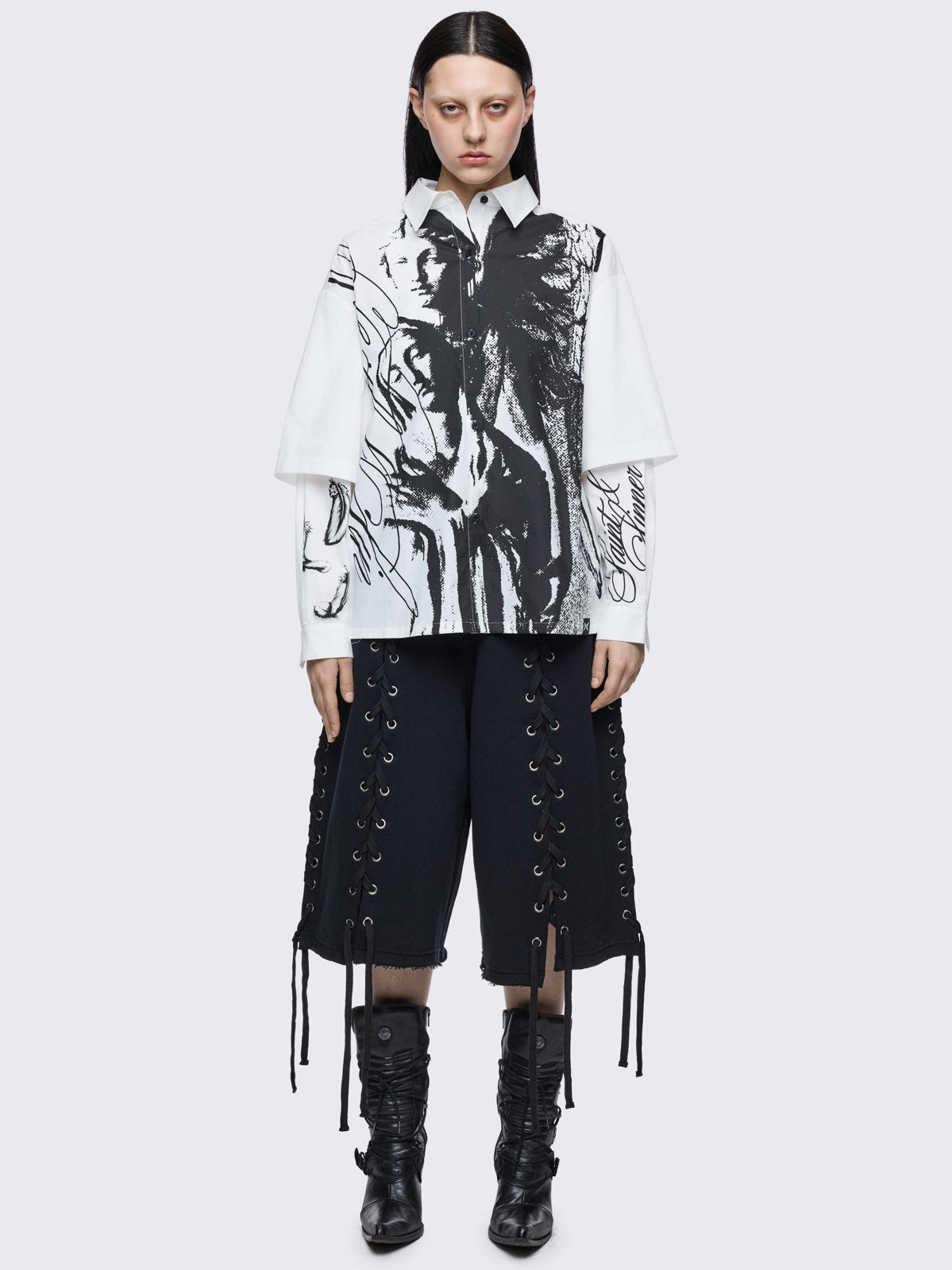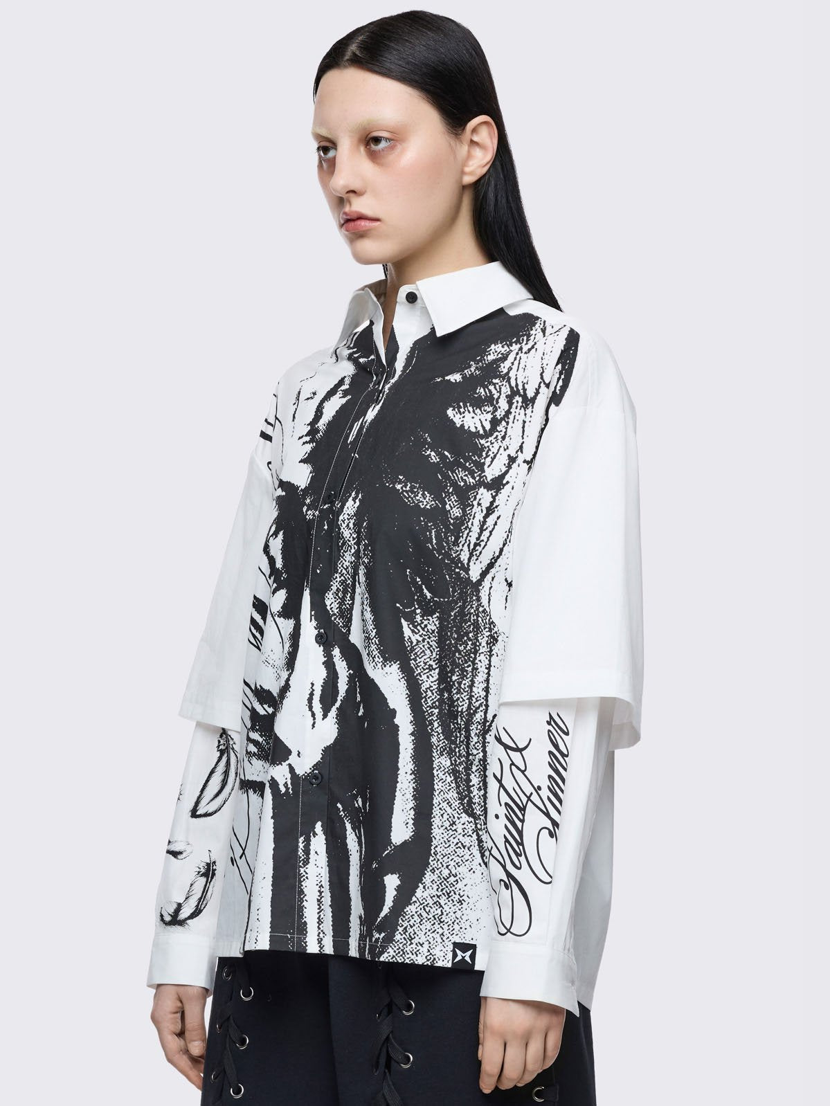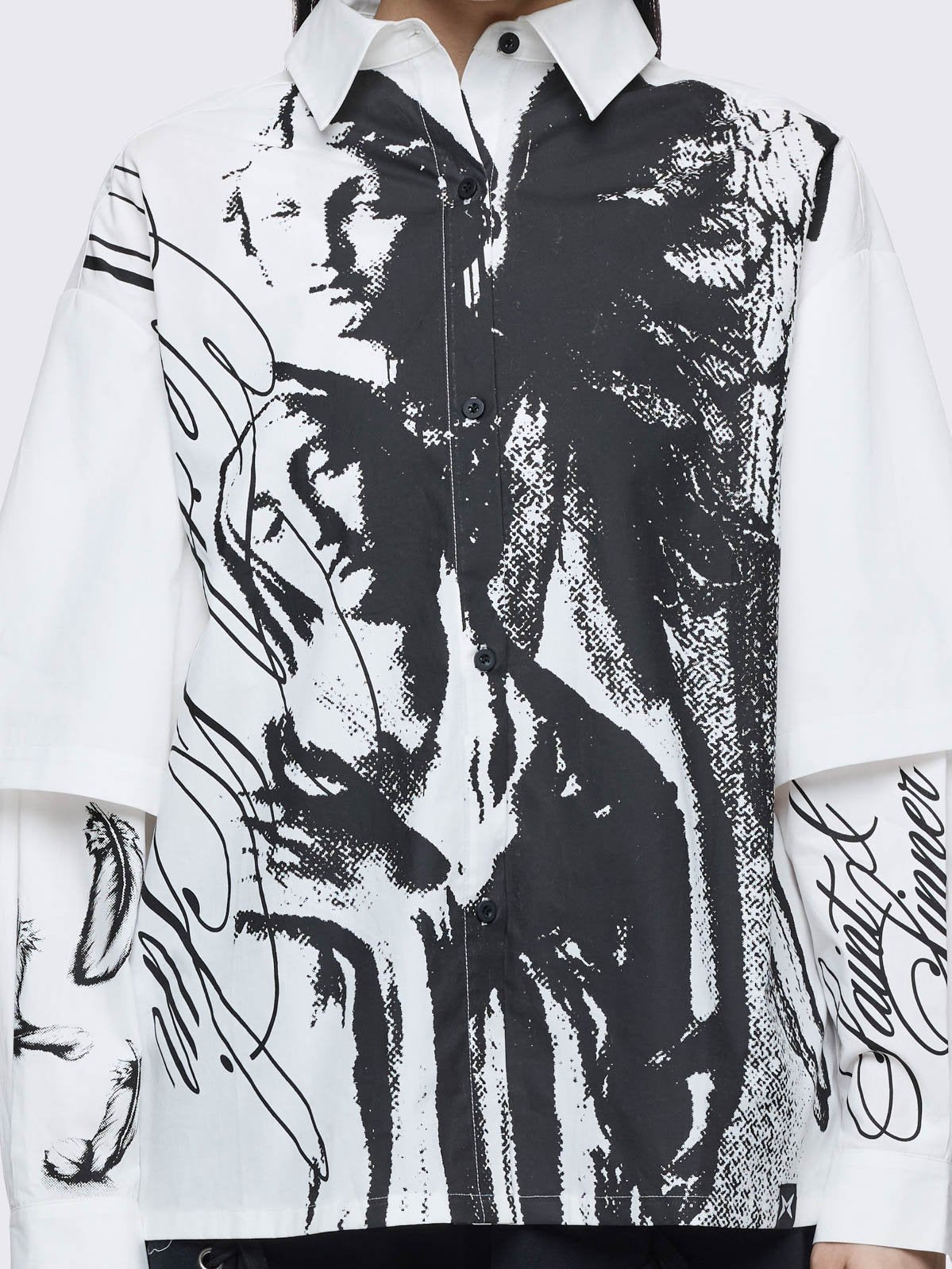 White layered oversized shirt with black faith & sinner graphic print