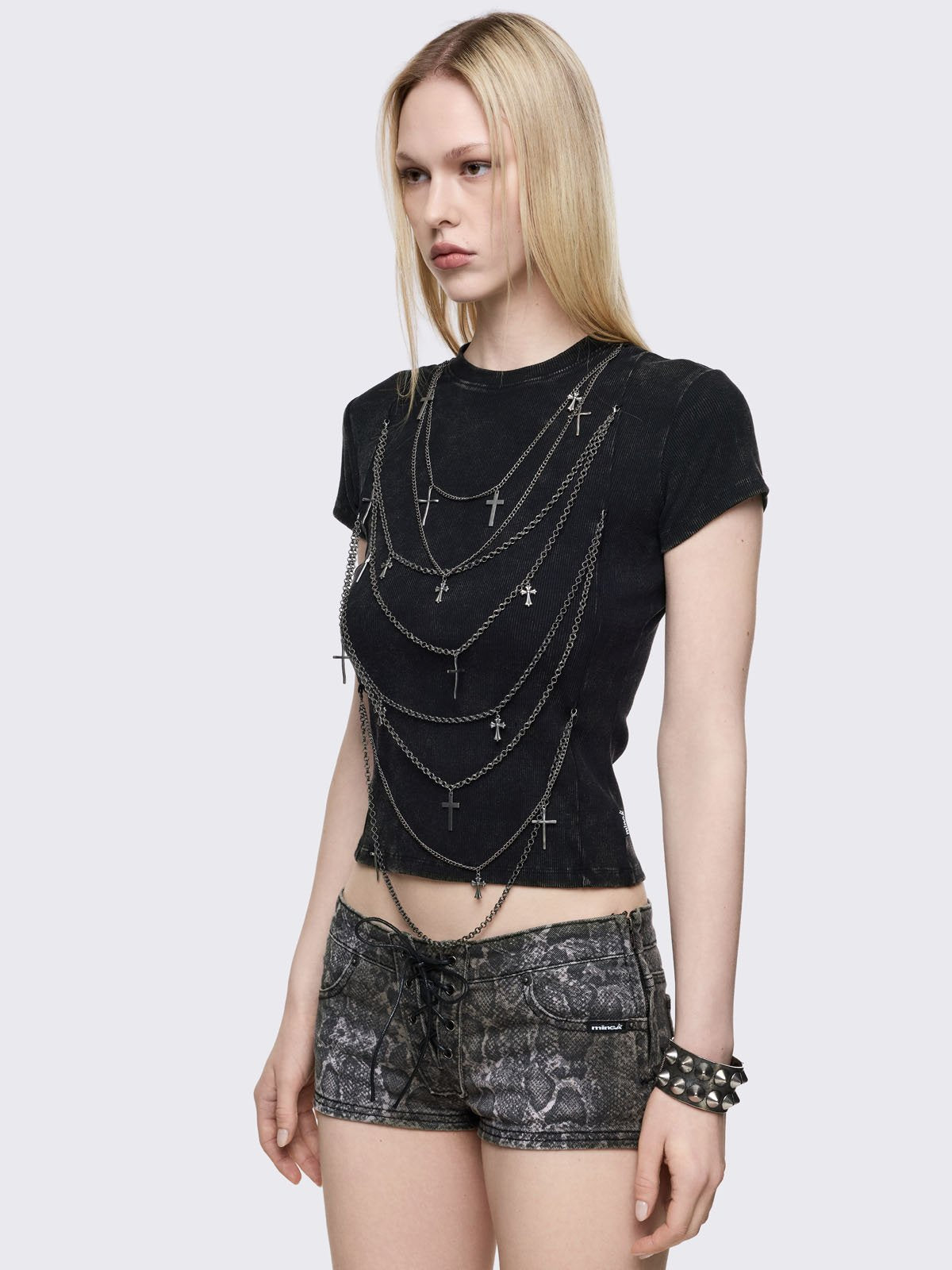 Black washed ribbed baby tee with multi-layered chain with cross pendants