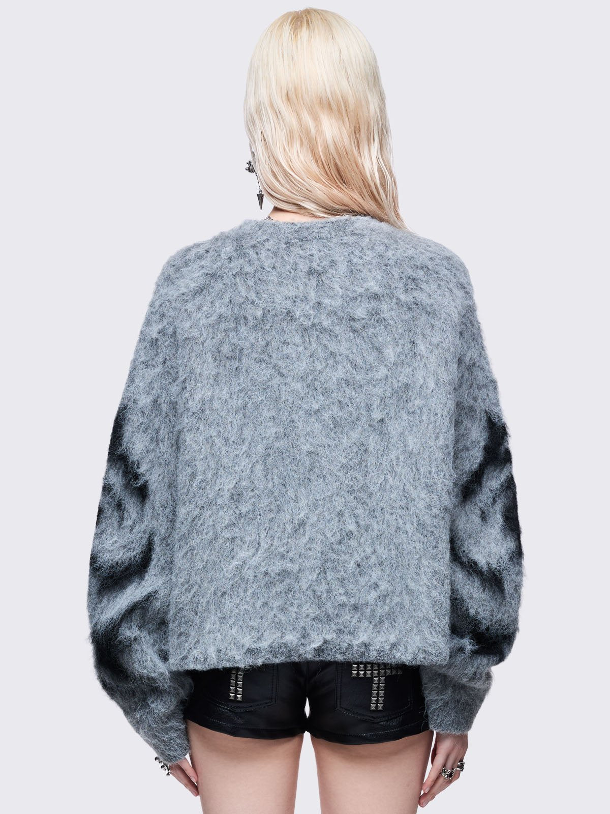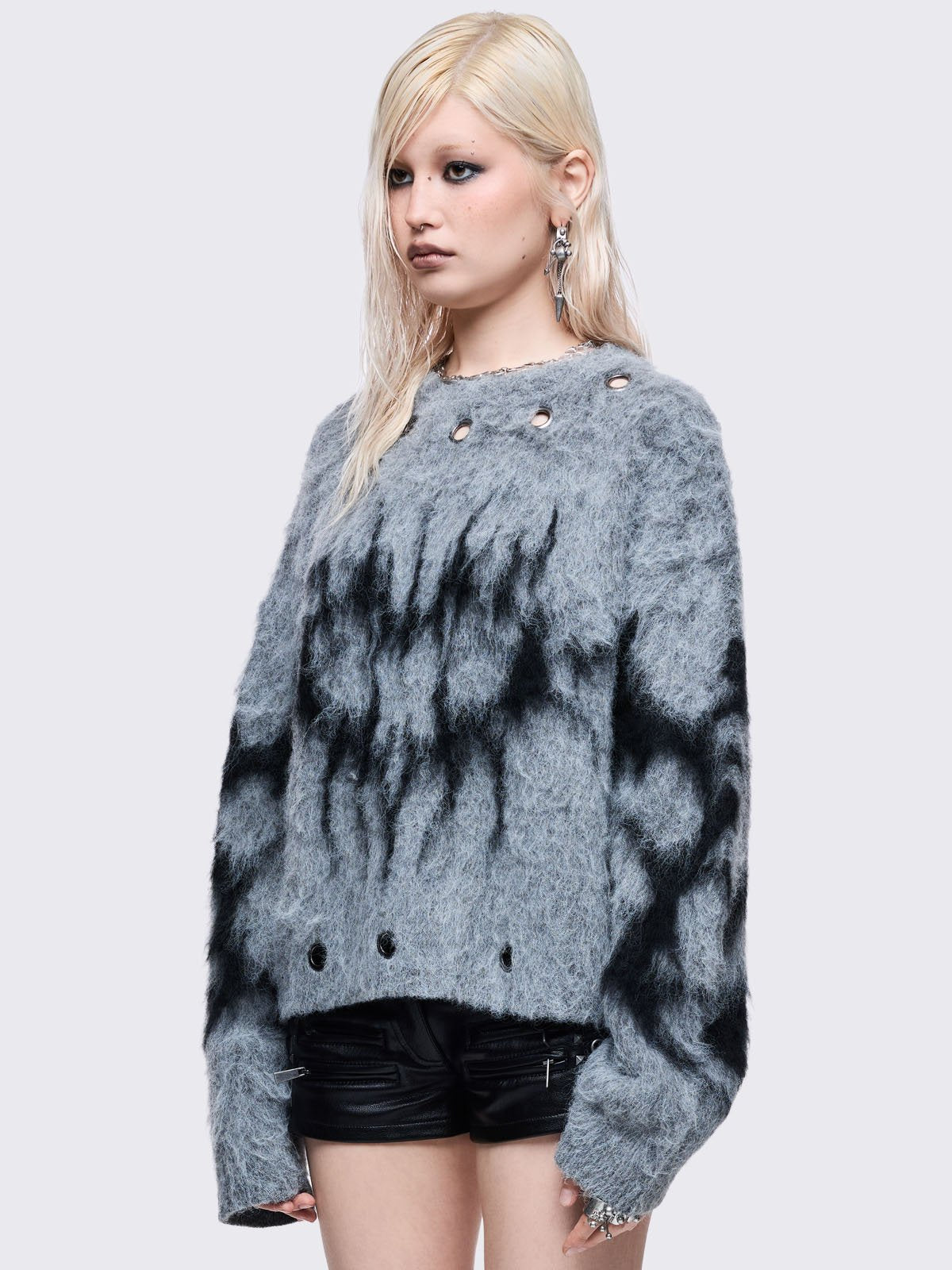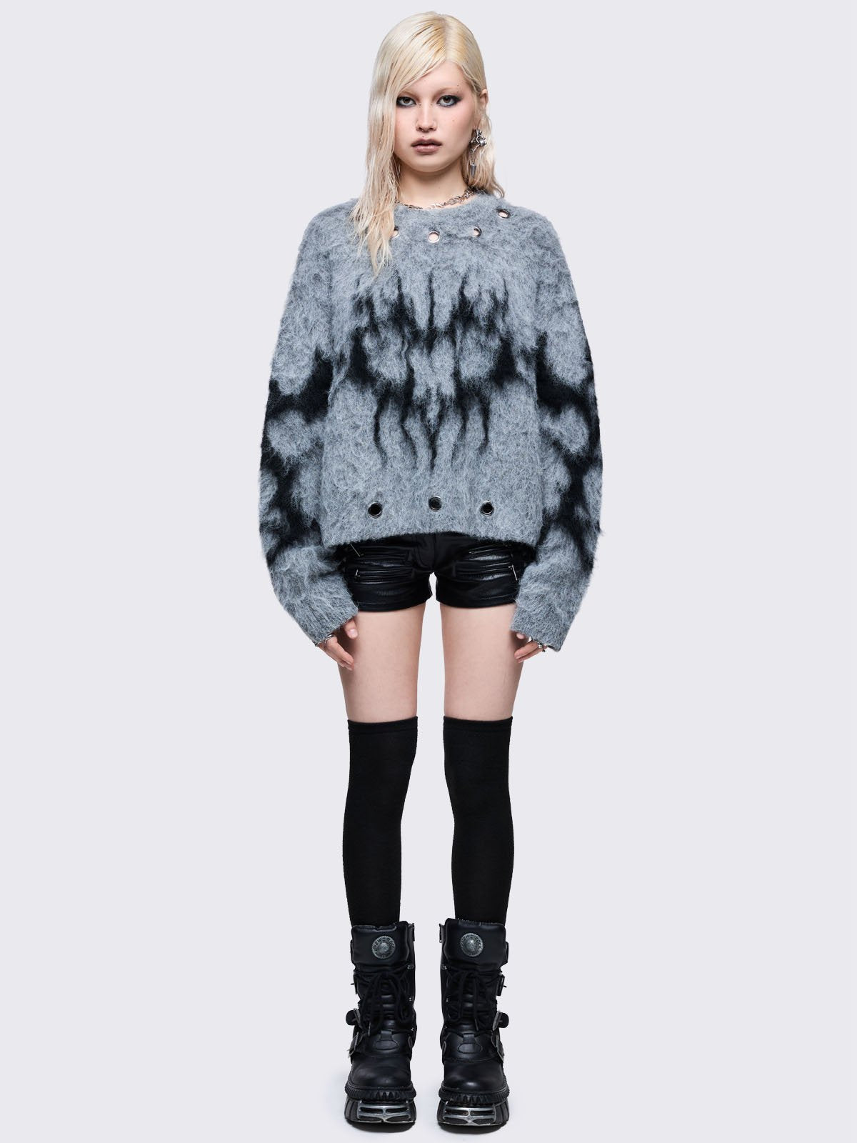 Grey knitted jumper with black sigil heart design and chunky silver eyelet details.
