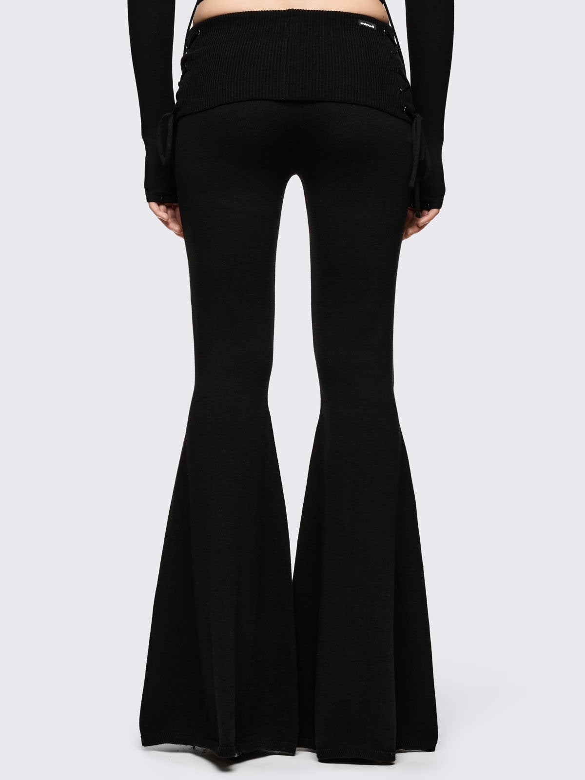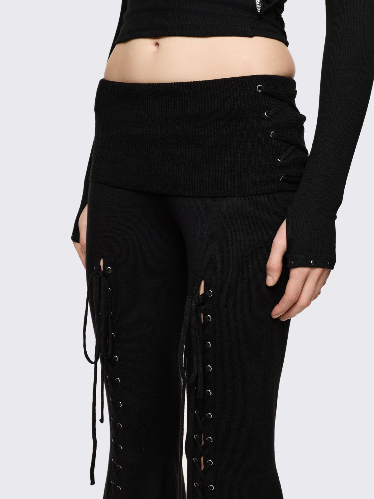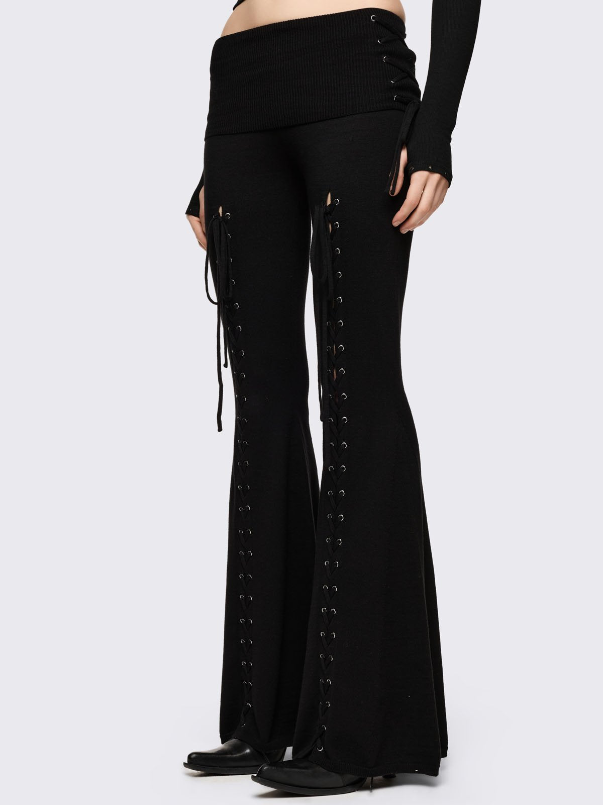 Black flare pants with front open lace-up corset details.